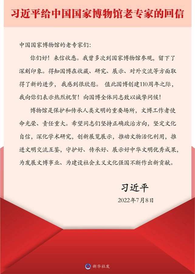 习近平总书记在中国国家博物馆创建110周年之际,给国博老专家回信,充分体现了以习近平同志为核心的党中央对国家博物馆发展、对文博工作的高度重视和对广大文博工作者的亲切关怀,为广大文博工作者奋进新征程、建功新时代提供了根本遵循。